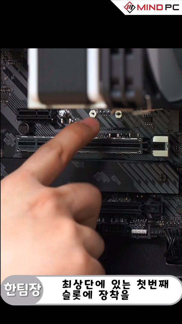 이때 메인보드 최상단에 있는 첫 번째 슬롯에 장착해주셔야 하며, 힘을 조금 주셔서 밀어넣어주시면 OK!