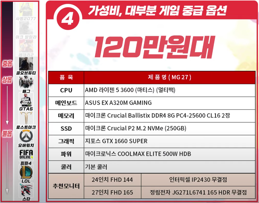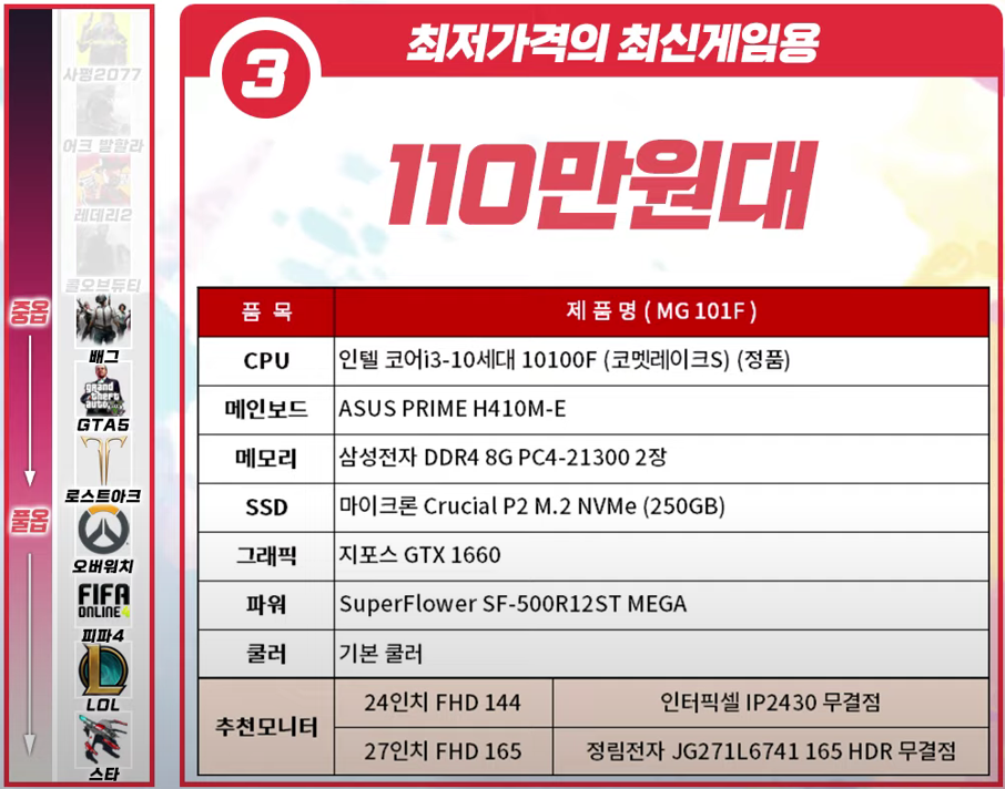 최신게임을 간단하게 즐길 수 있는 가장 저렴한 본체 제품이라고 보시면 될 것 같습니다. 100만 원대에서 온라인 게임이나 최신 게임을 쾌적하게 즐길 수 있는 PC가 없을까? 고민 중이시라면 이 견적을 추천합니다.