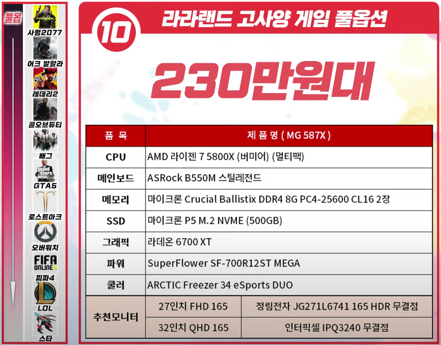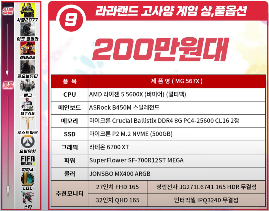 CPU는 5600X, 그래픽카드는 라데온 6700XT가 탑재되는 '라라랜드' 조합의 PC 견적입니다. 라데온 6700XT는 엔비디아 지포스 RTX 3060 Ti ~ 3070 사이의 성능을 보여주기 때문에, 재고 구하기 힘든 RTX 그래픽카드를 대신할 대체품으로 손색 없는 제품입니다.