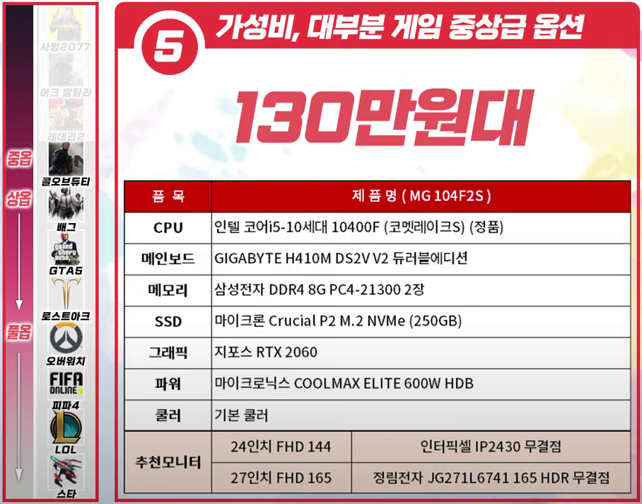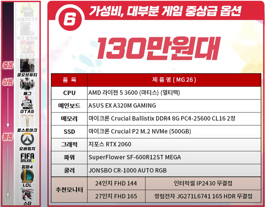 이 본체 견적부터 GTA5, 배틀그라운드 등의 고사양 게임을 중~상옵 정도로 쾌적하게 플레이 가능합니다. 대부분의 게임을 중상옵 정도로 쾌적하게 플레이할 수 있고, 콜 오브 듀티 모던 워페어 까지도 충분히 쾌적하게 플레이할 수 있습니다. (다만 사이버펑크 2077 등과 같은 트리플A급 게임을 플레이하기엔 다소 무리가 있으니, 트리플A급 게임을 주로 플레이하시는 분들은 다음에 소개할 견적부터 참고하시면 좋을 것 같습니다.) 1920X1080 해상도에서 144주사율 모니터를 사용하시는 분들께 가장 추천할만한 게이밍PC 제품이며, 아마 이 시국에 가장 가성비 있는 게이밍 본체가 되지 않을까 싶습니다.