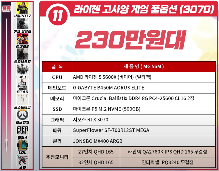 CPU는 라이젠 5600X 멀티팩, 메인보드는 기가바이트 B450M 어로스 엘리트, 메모리는 마이크론 Ballistix 8G 25600 2장, SSD는 마이크론 P5 M.2 NVMe 500GB 용량이 탑재됩니다. 그래픽카드는 지포스 RTX 3070 제품이 들어가지만, RTX 3070의 가격대가 상당히 높고 재고도 구하기 힘들기 때문에 9번째 MG567X나 10번째 MG587X 제품으로 대체해보시는 것도 추천합니다.