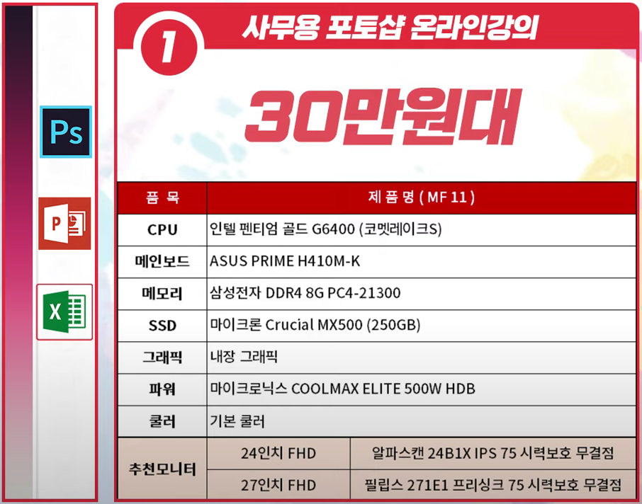파워포인트, 엑셀 등 오피스 프로그램과 한글 같은 문서 작업, 온라인 강의, 웹서핑, 간단한 포토샵을 진행할 수 있도록 구성한 제품입니다. 게이밍용이 아니기 때문에 간단한 게임도 함께 즐기고 싶으신 분들은 다음에 소개할 견적부터 참고하심이 좋을 것 같습니다.