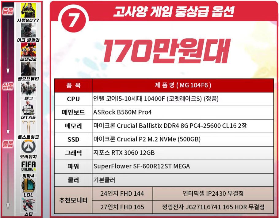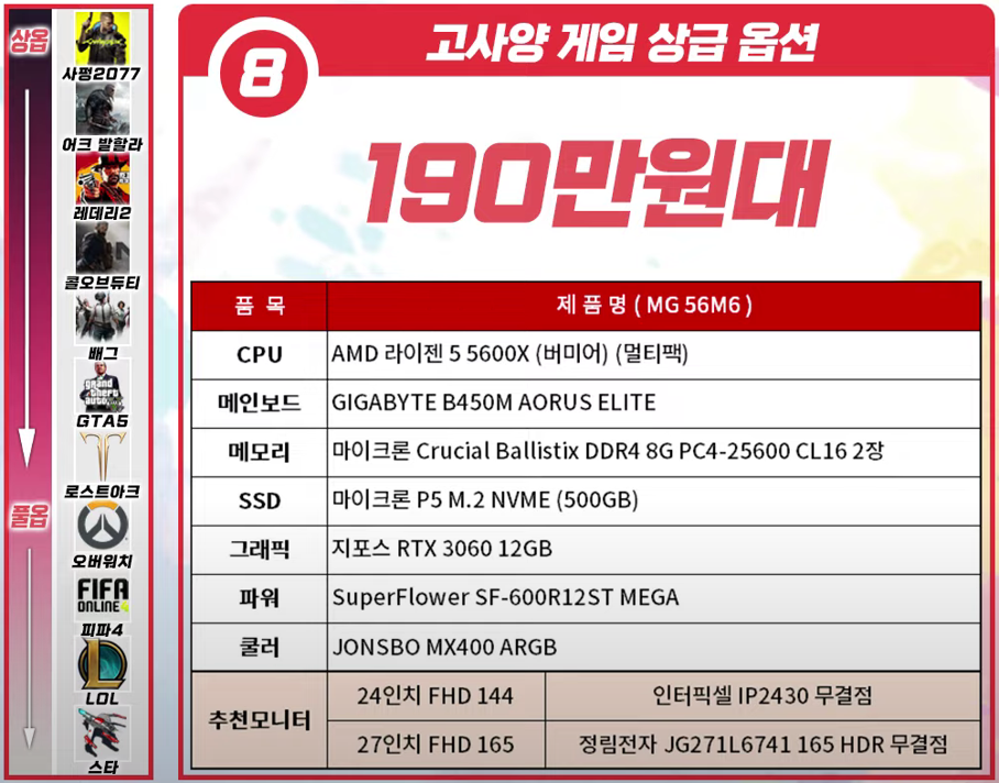 대부분의 게임을 상옵으로 플레이할 수 있고, 사이버펑크 2077과 같은 트리플A급 게임을 중옵 정도에서 쾌적하게 플레이할 수 있는 제품입니다. 배그를 풀옵으로 즐기고 싶으신 분들은 이 제품부터 선택하시면 될 것 같습니다.