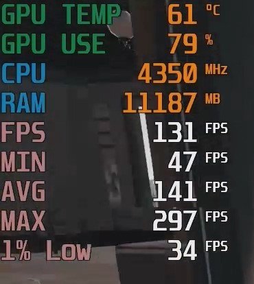 FPS는 현재 프레임 수치, MIN는 최소 프레임 수치, AVG는 평균 프레임 수치, MAX는 최대 프레임 수치, 1% LOW는 하위 1% 프레임 수치를 나타냅니다. 하위 1% 수치는 높으면 높을수록 게임이 안정적이고 부드럽게 구동됩니다.