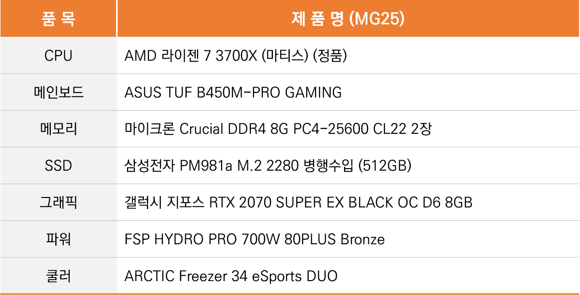 CPU는 라이젠 7 3700X, 그래픽카드는 갤럭시 RTX 2070 SUPER EX BLACK, 메인보드는 ASUS TUF B450M-PRO GAMING 제품이 들어갑니다.