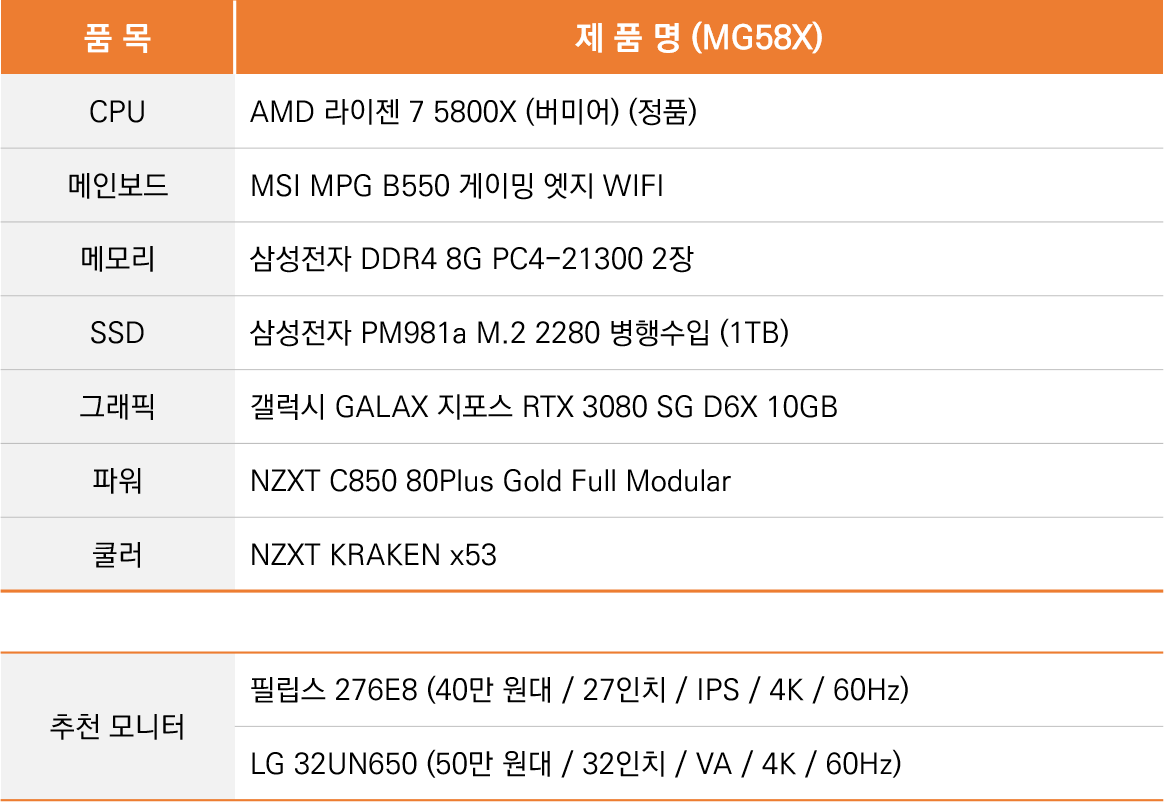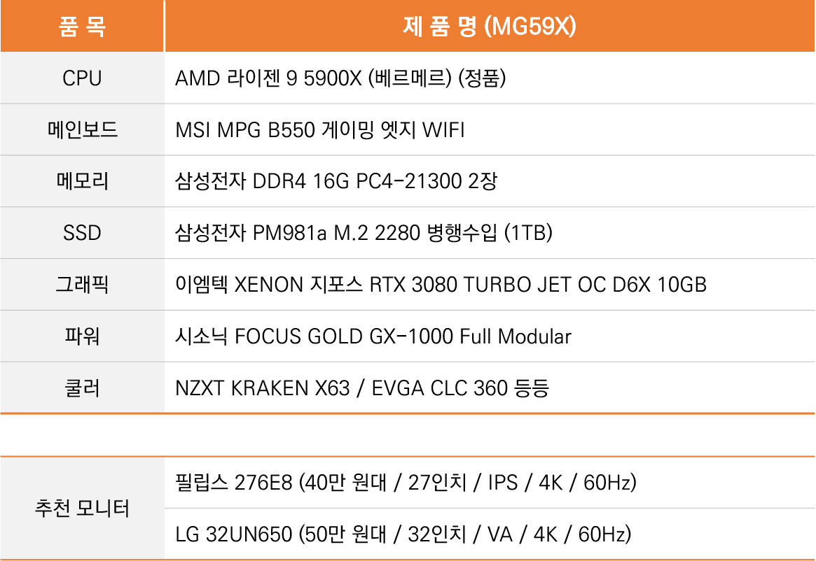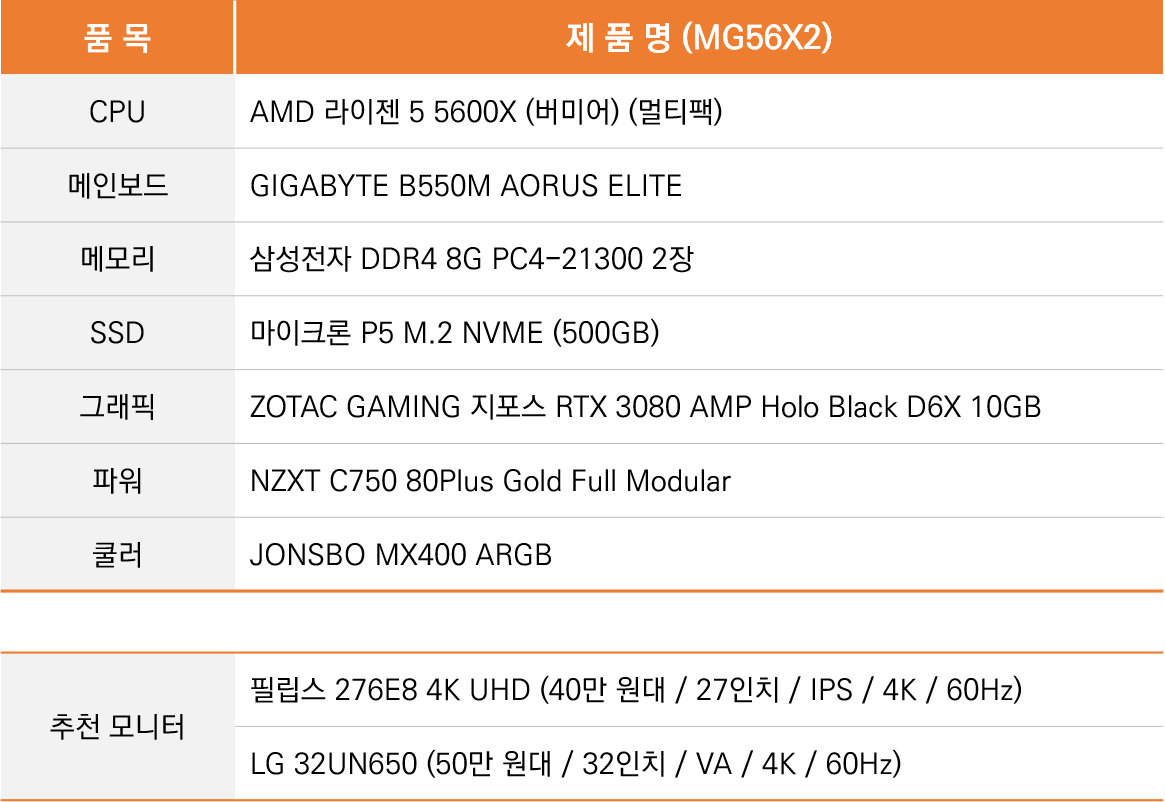 라이젠 5 5600X와 RTX 3080이 탑재된 고사양 PC 견적입니다. 4K 기준 최신 게임을 풀옵으로 플레이할 수 있는 괴물 같은 성능을 보여주는 제품이고, 영상 편집 등 작업용으로 아주 훌륭한 견적입니다. 모니터는 본체의 성능을 십분 활용할 수 있는 4K 모니터를 추천합니다.