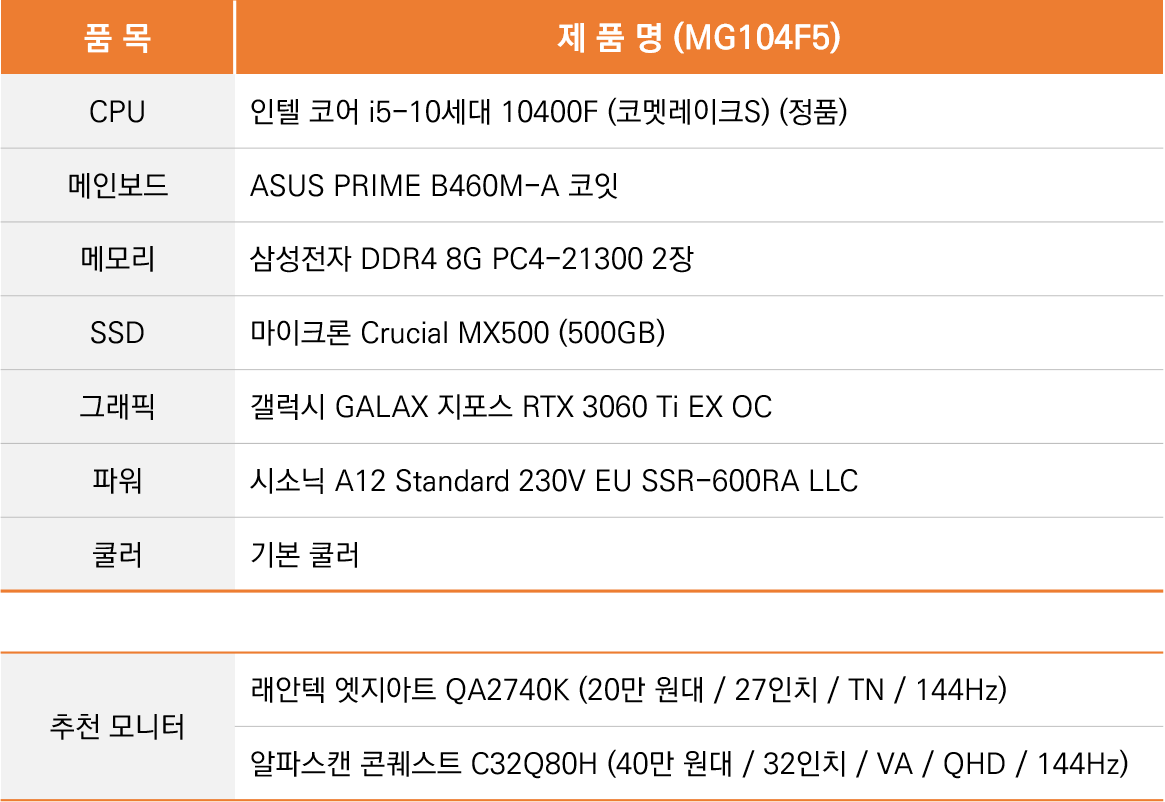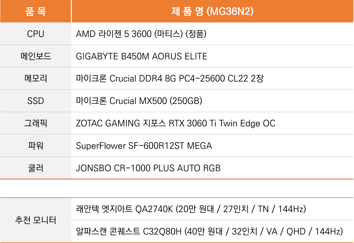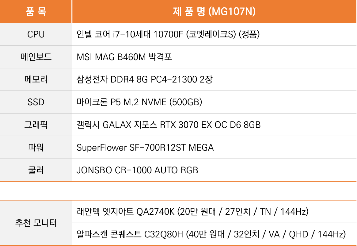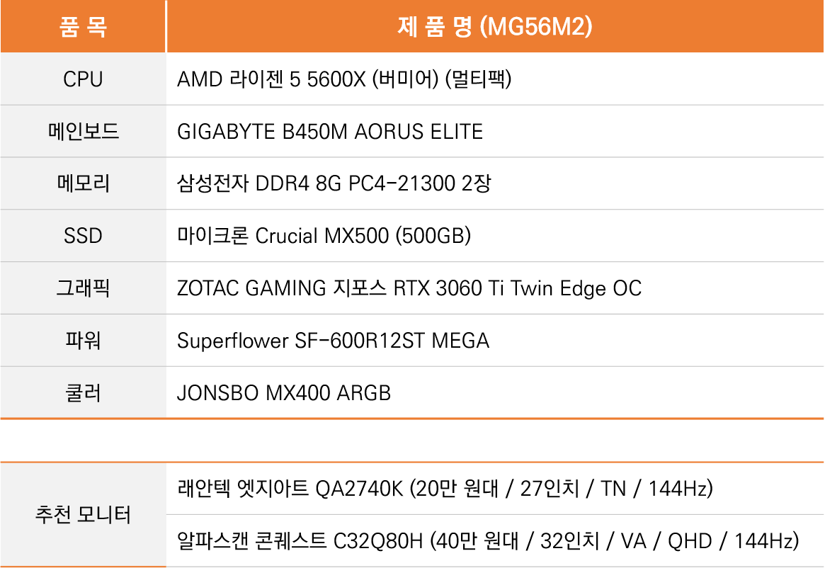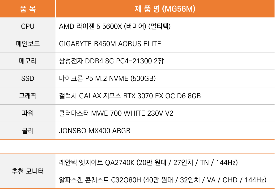 라이젠 5 5600X와 RTX 3070이 탑재된 고사양 PC 견적입니다. QHD 기준 모든 게임을 풀옵 이상에서 안정적으로 플레이할 수 있습니다. (B550 칩셋으로 변경 원하신다면 MG56X 제품을 추천합니다)