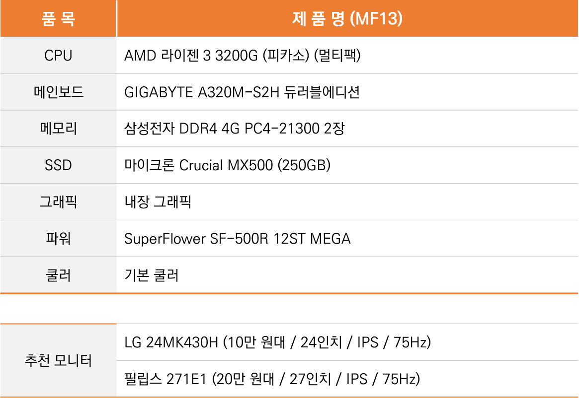 CPU가 라이젠 3400G로 4코어 8스레드 제품이기 때문에 무거운 사무작업 주로 하시는 분께 알맞은 견적입니다. 가벼운 게이밍과 포토샵 작업에도 좋습니다.