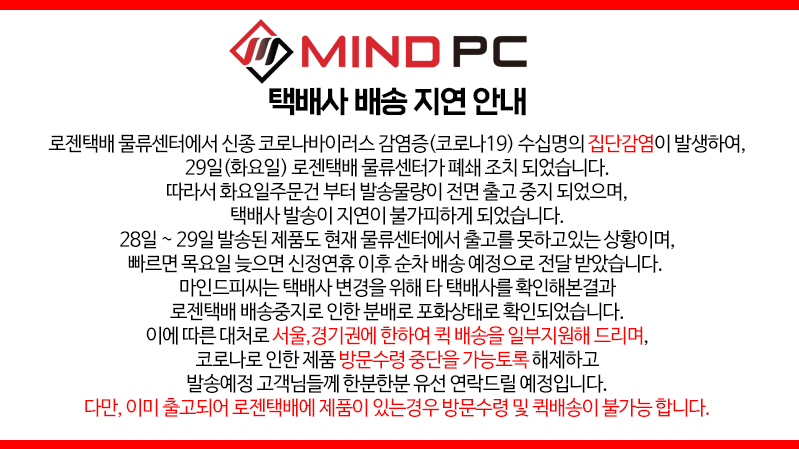 마인드PC의 택배사 로젠택배 물류센터에서 신종 코로나바이러스(코로나19)로 수십명의 집단감염이 발생하여, 29일(화요일)부터 로젠택배 물류센터가 폐쇄 조치되었습니다.