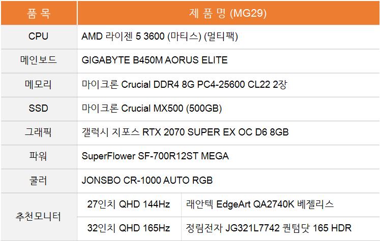 CPU는 MG27과 마찬가지로 AMD 라이젠 3600 제품이 탑재되지만, 그래픽카드가 RTX 2060 제품이 탑재되기 때문에 조금 더 고사양의 게임까지 즐길 수 있는 게이밍 PC입니다. 대부분의 게임을 FHD 환경에서 상옵 정도로 원활하게 플레이하실 수 있으며, 콜 오브 듀티, 레드 데드 리뎀션 등과 같은 고사양 게임도 중옵 정도로 플레이하실 수 있습니다.