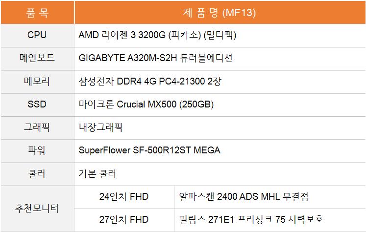 CPU는 라이젠 3200G가 들어가며 내장그래픽이 사용됩니다.