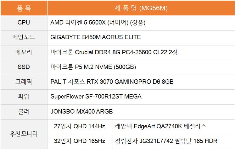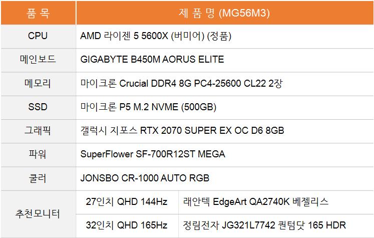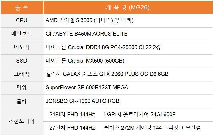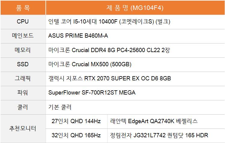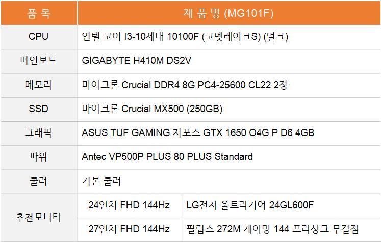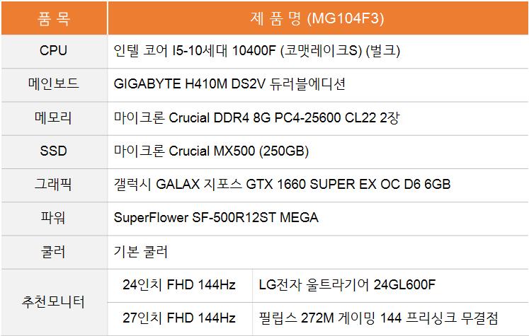앞서 설명드린 5번째 견적 'MG104F3'와 비슷한 사양의 제품으로, 인텔과 라이젠 CPU 선호도에 따라 선택하시면 됩니다.