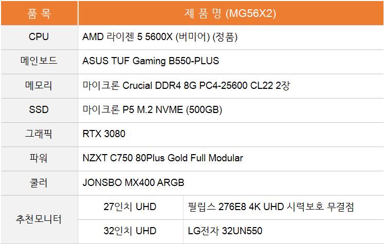 견적에는 AMD 라이젠 5600X CPU와 RTX 3080 그래픽카드 제품이 들어가는데요. RTX 3080의 재고가 워낙 구하기 어려운 상황이다보니 그래픽카드 제조사는 재고 상황에 따라 바뀔 수 있으니 이 부분 참고 부탁드립니다.