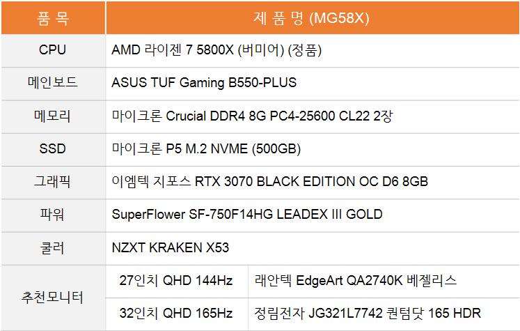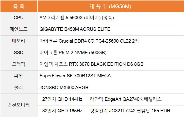 왜 5600X와 3060 Ti 조합은 없고, 3070 조합만 있느냐? 궁금해하실 텐데요. 5600X+3060 Ti와 5600+3070의 가격 차이가 거의 없다는 사실... 그럼 3070 그래픽카드를 넣는 게 좋겠죠?