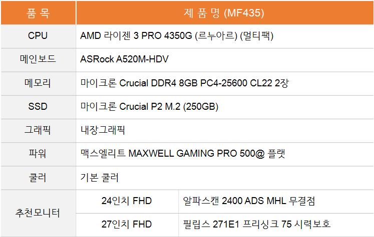 첫 번째로 소개해드린 MF13보다 한 단계 높은 사양의 사무용PC로, MF13이 '사원급' PC, MF435는 '부장급' PC라고 생각하시면 편할 것 같습니다.