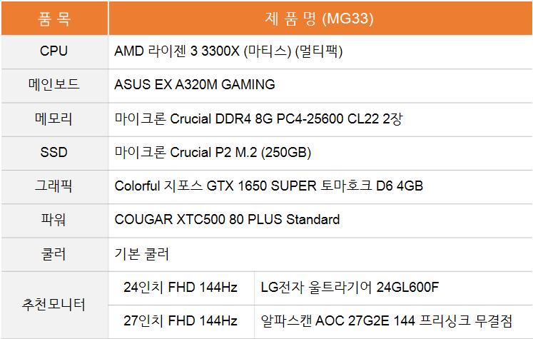라이젠 3300X와 GTX 1650 SUPER의 조합으로, 배틀그라운드, GTA5, 콜 오브 듀티 같은 고사양 게임도 옵션 타협을 하시면 원활하게 플레이하실 수 있습니다.