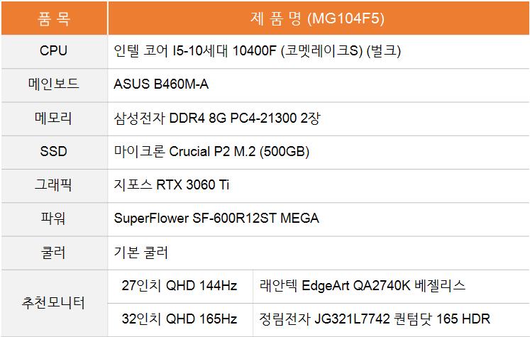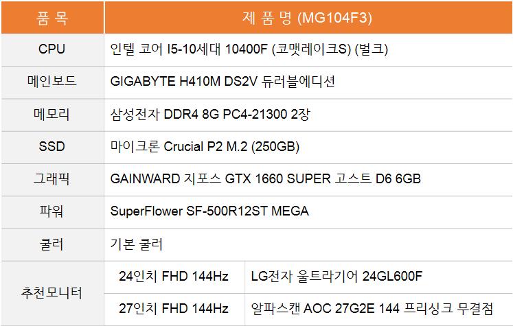 5번째 추천 견적인 MG104F3과 비슷한 사양의 견적으로, 인텔과 라이젠 선호도에 따라 선택하시면 될 것 같습니다.