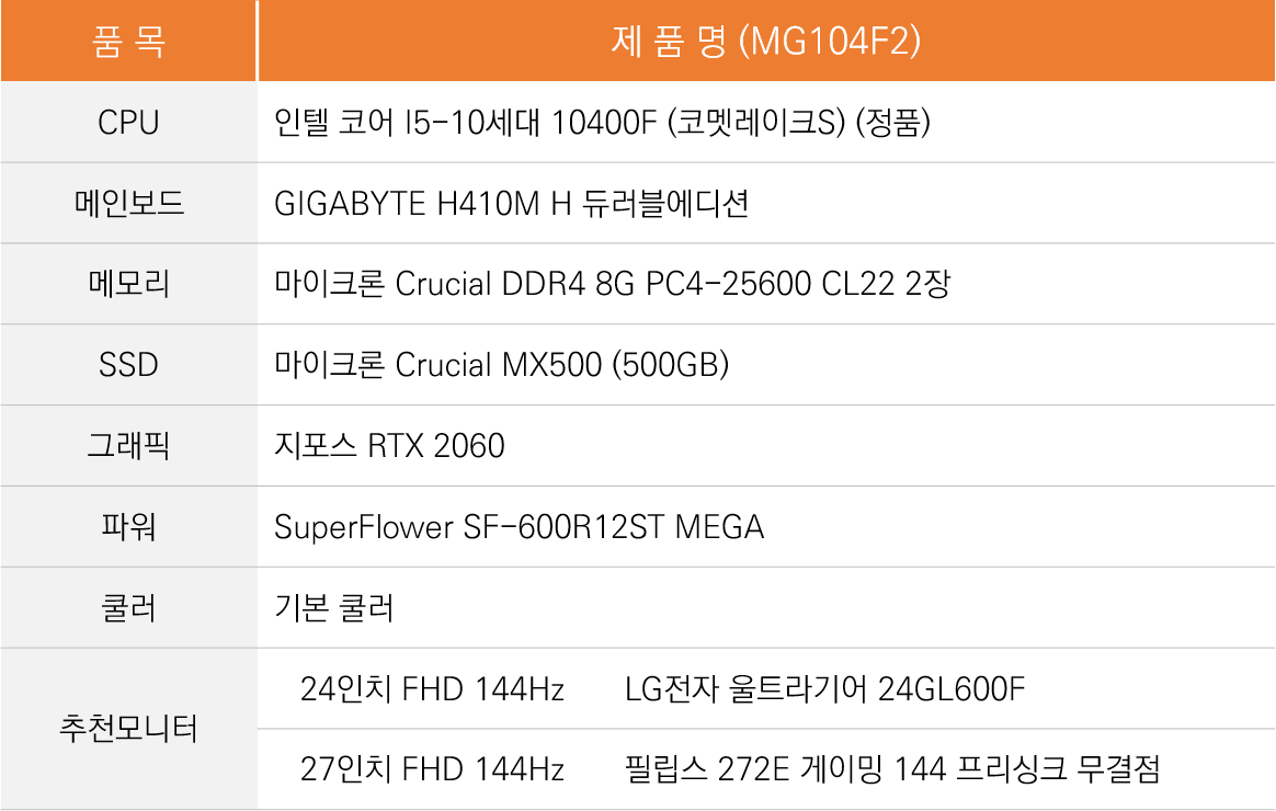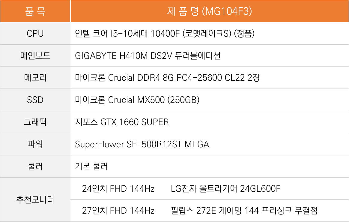 AMD 라이젠 5 3600 CPU로 구성된 게이밍PC 견적으로, 같은 90만 원대 견적인 MG104F3와 동등한 성능의 견적입니다. AMD 라이젠과 인텔 CPU 중 선호하는 CPU 견적으로 선택하시면 될 것 같습니다. 그래픽카드는 MG104F3와 마찬가지로 GTX 1660 SUPER로 구성되는데, 이 역시 재고 상황에 따라 여러 제조사 제품으로 변경되어 구성됩니다.