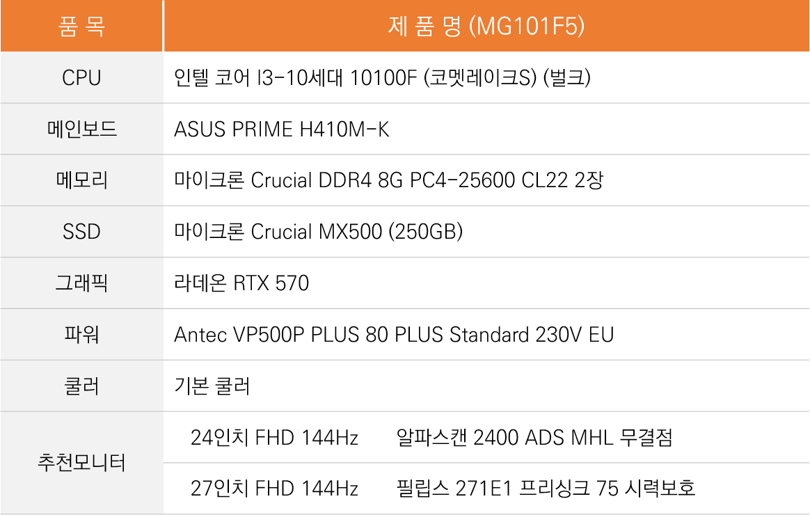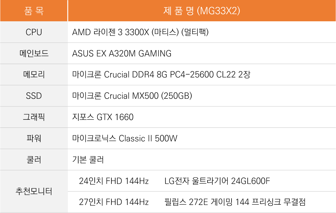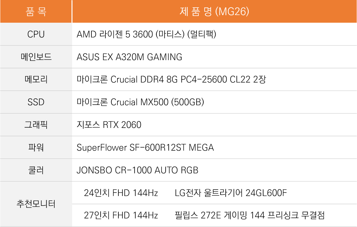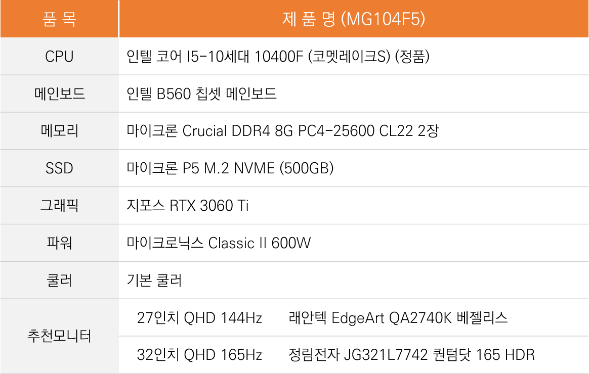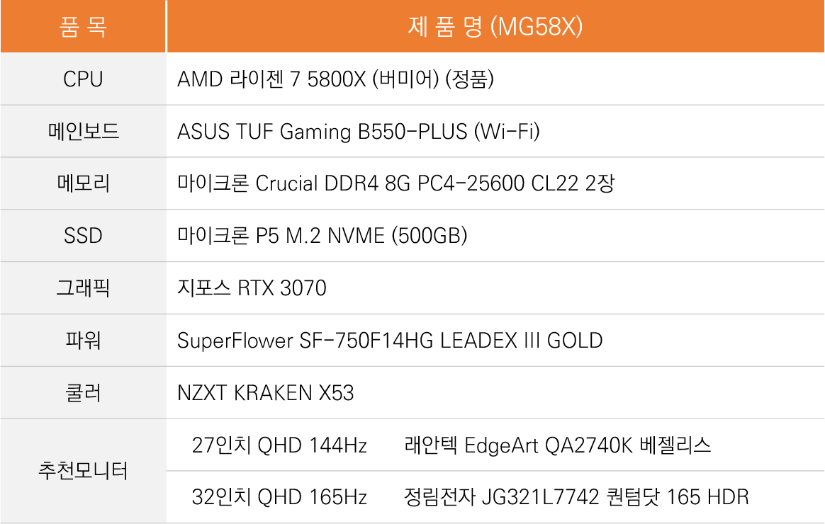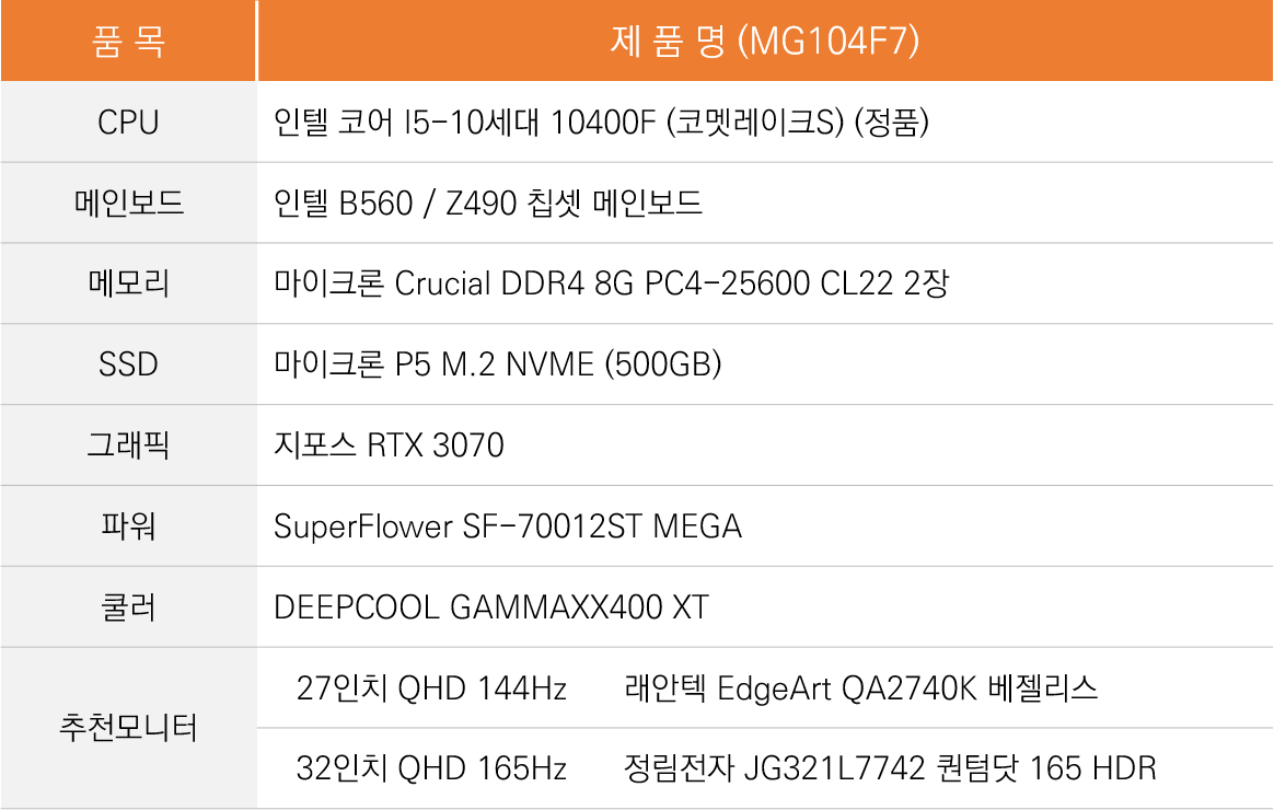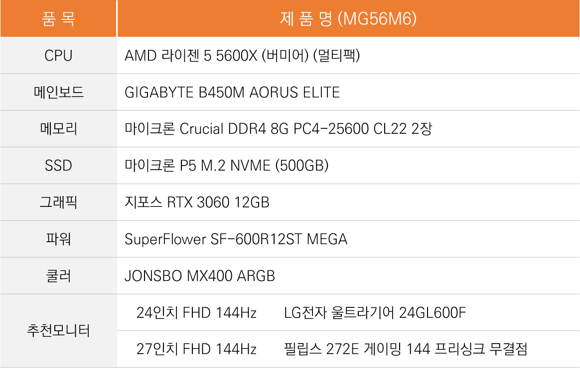 AMD 라이젠 5 5600X CPU와 RTX 3070 그래픽카드의 조합입니다. 비슷한 사양의 MG107F에 비해 가격이 20만 원 정도 더 높죠. 트리플A급 게임을 QHD 해상도에서 원활하게 플레이할 수 있는 견적입니다.