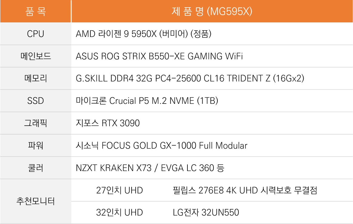 AMD 라이젠 9 5950X와 RTX 3090 조합으로, RTX 3090의 인기가 높아서 이 제품 역시 품절될 가능성이 크다는 점 참고 부탁드립니다. 작업 성능, 게임 성능 모두 현재 PC 견적 중 최고의 성능을 자랑하는 견적입니다.