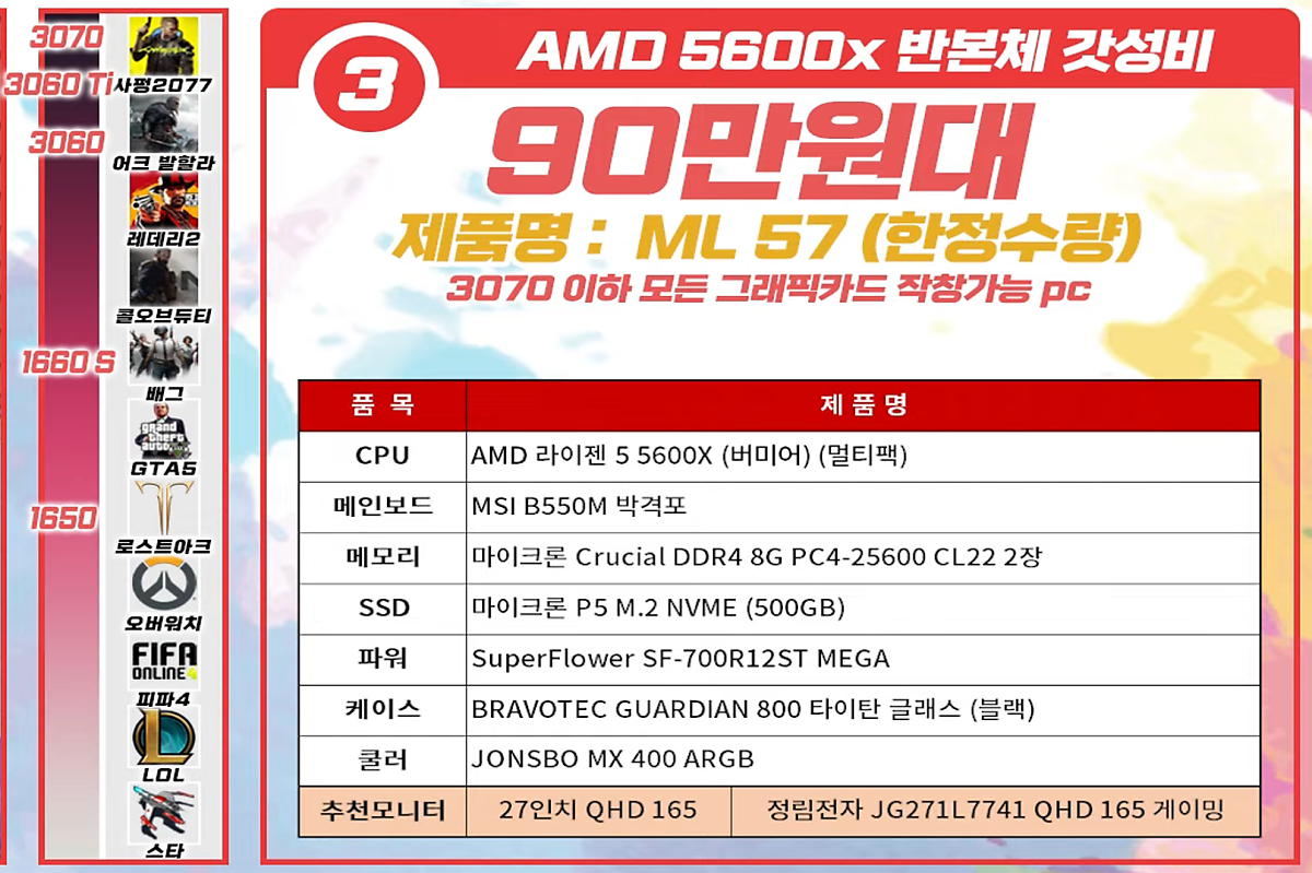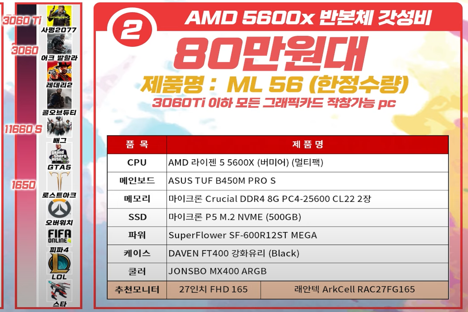 스펙 : 라이젠 5600X (RTX 3060 Ti 까지 호환 가능)