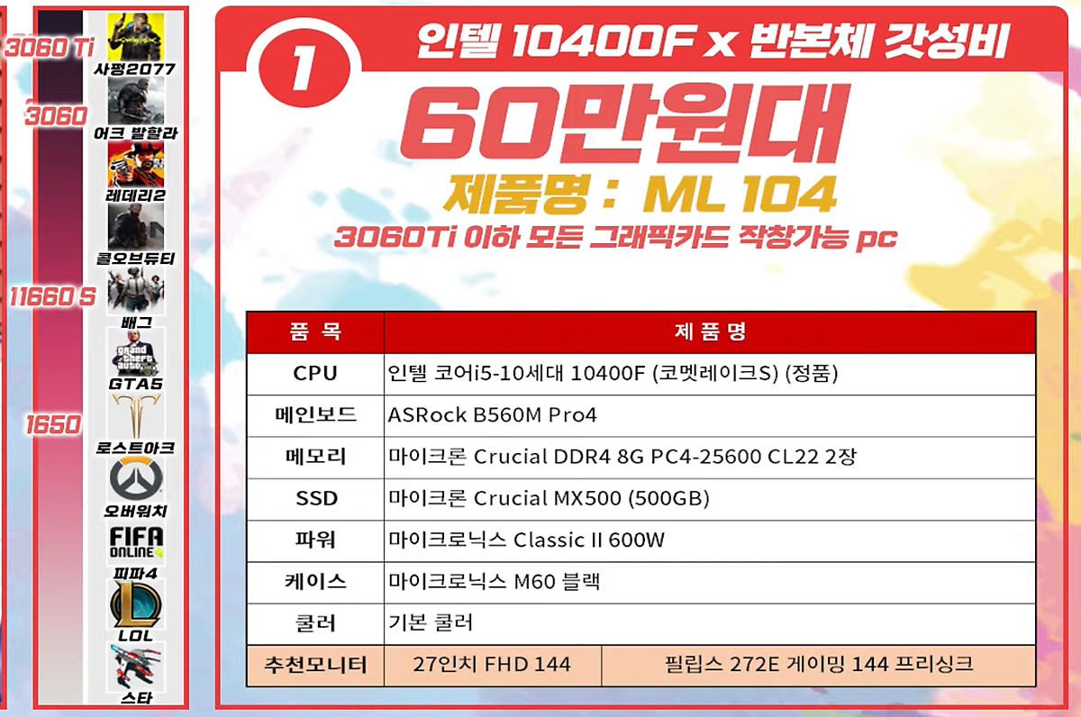 스펙 : 인텔 I5 10400F (RTX 3060 Ti 까지 호환 가능)