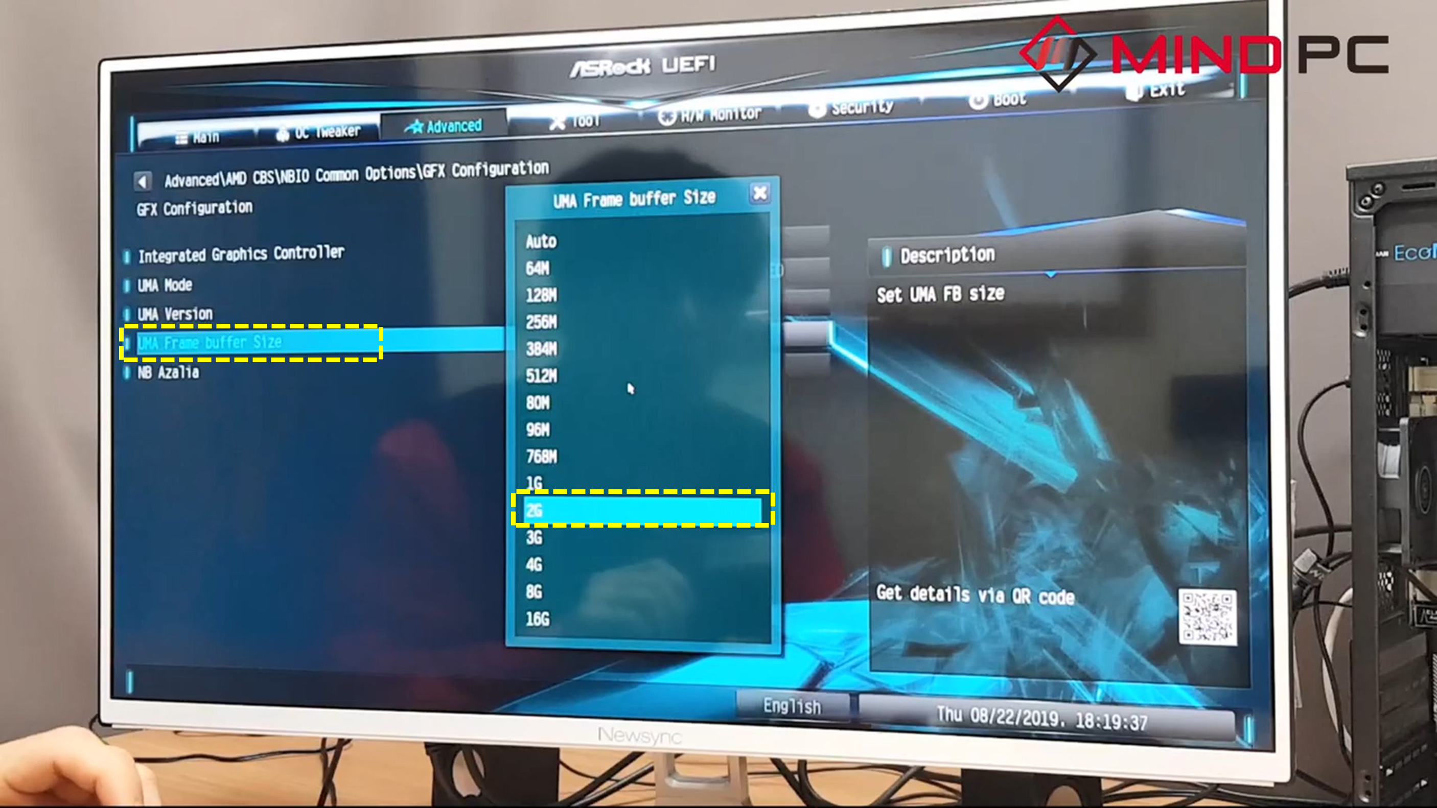 UMA Frame bufer Size를 마인드피씨에서 권장하는 용량인 2G로 설정해주세요.