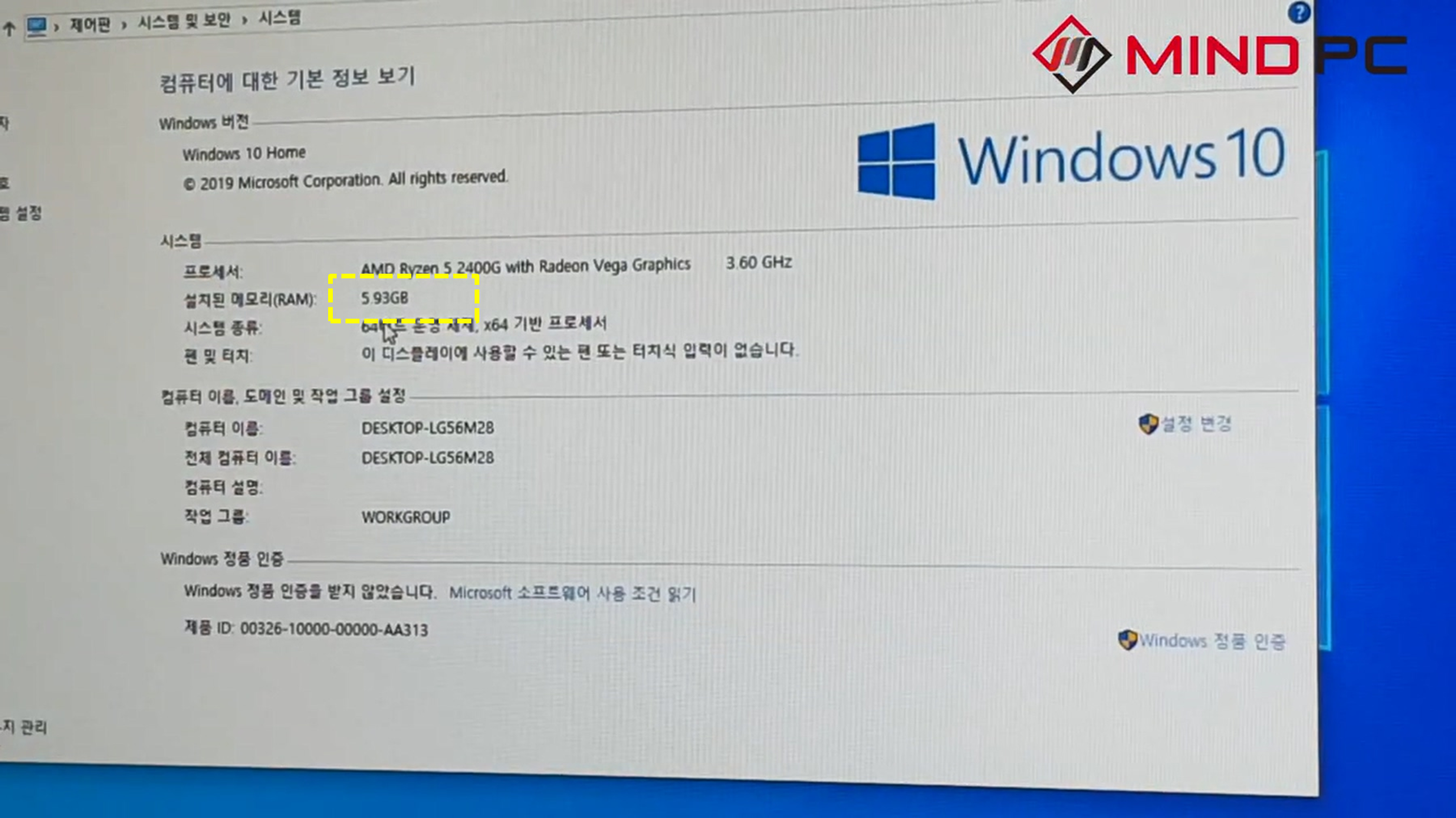 여기에서 설치된 메모리 용량이 8G로 떠야 하는데 여기도 마찬가지로 6G 정도만 표시된 걸 볼 수 있습니다. 라이젠 내장그래픽이 2G를 끌어다 쓰고 있기 때문이죠.