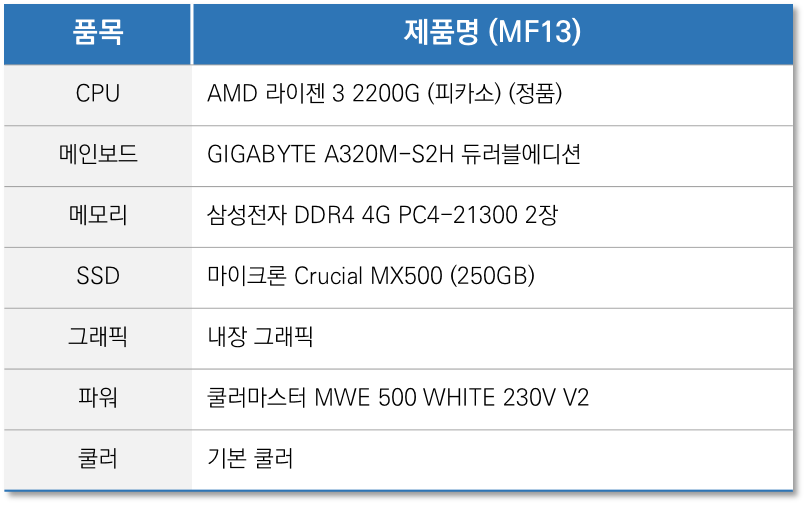 만약 여기에서 사양을 조금 더 올리고 싶으신 분은, CPU를 라이젠 3400G로 바꿔주시면 됩니다. 이 경우 추가금액이 약 7만원 정도 발생되니 참고 부탁드립니다.