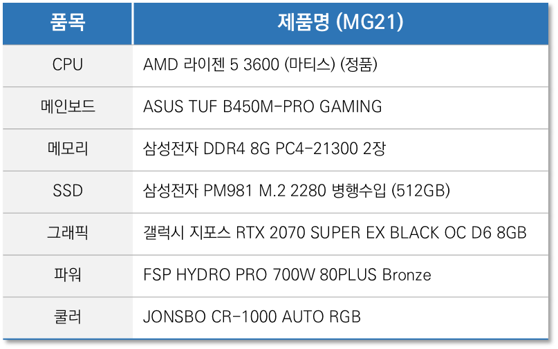 4월 월간견적과 부품 구성이 같습니다. 메인보드는ASUS TUF B450M-PRO GAMING 제품이 들어가는데요, 만약 박격포 MAX 제품을 원하시는 분들은 해당 제품으로 변경하셔도 됩니다. 파워 제품은 SuperFlower 600 MEGA 제품이 들어가는데, 만약 부품을 업그레이드할 예정이 있으신 분들은 파워 용량을 700 이상으로 같이 업그레이드 해주셔야 합니다.