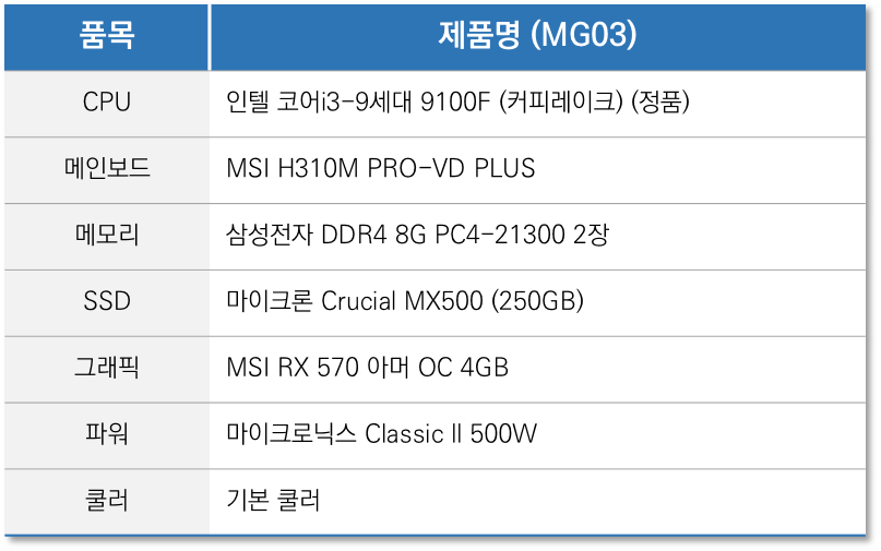 기본적인 국산 RPG 게임을 간단하게 돌리는 저사양 게이밍PC로 추천합니다. 리그 오브 레전드, 오버워치 하옵에서 중옵 정도 가능한 제품입니다. 다만 배틀그라운드는 원활한 플레이가 조금 어려운 견적이라 배틀그라운드를 돌리시려면 조금 더 업그레이드 된 사양을 추천드립니다.