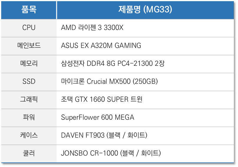 CPU는 라이젠 3 3300X, 메인보드는 ASUS EX 320 게이밍, 메모리는 삼성전자 8GB 21300 2장, 그래픽카드는 조택 GTX 1660 SUPER 트윈, SSD는 마이크론 MX500 250GB, 파워는 슈퍼플라워 600 MEGA, 케이스는 데이븐 FT903, CPU 쿨러는 존스보 CR-1000으로 구성됩니다.