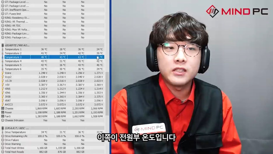 CPU 전원부쪽 온도는 최대 63도로 나왔는데요, 기가바이트 Z490 어로스 엘리트 메인보드의 전원부가 쿨링이 굉장히 잘 되고 있다는 걸 확인할 수 있습니다.