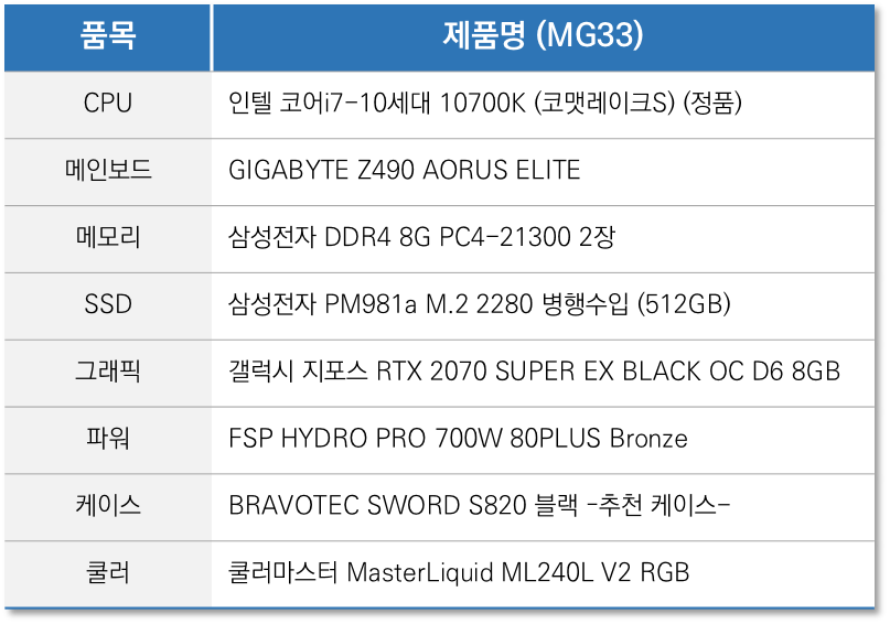 이밖에도 그래픽카드는 지금 너무나 사랑받는 중인 갤럭시 RTX 2070 SUPER 그래픽카드가 탑재됩니다. SSD는 삼성전자 PM981a M.2 제품이 들어갑니다. (게임할 때 로딩 속도 1초라도 줄여야겠죠?) 파워는 FSP 하이드로 프로 700W 제품이 들어가고, 케이스로는 브라보텍 S820 제품이 들어갑니다. CPU 쿨러는 쿨러마스터의 MasterLiquid ML240L V2 RGB 제품이 들어갑니다. LED도 예쁘고 가성비도 훌륭한 제품입니다.