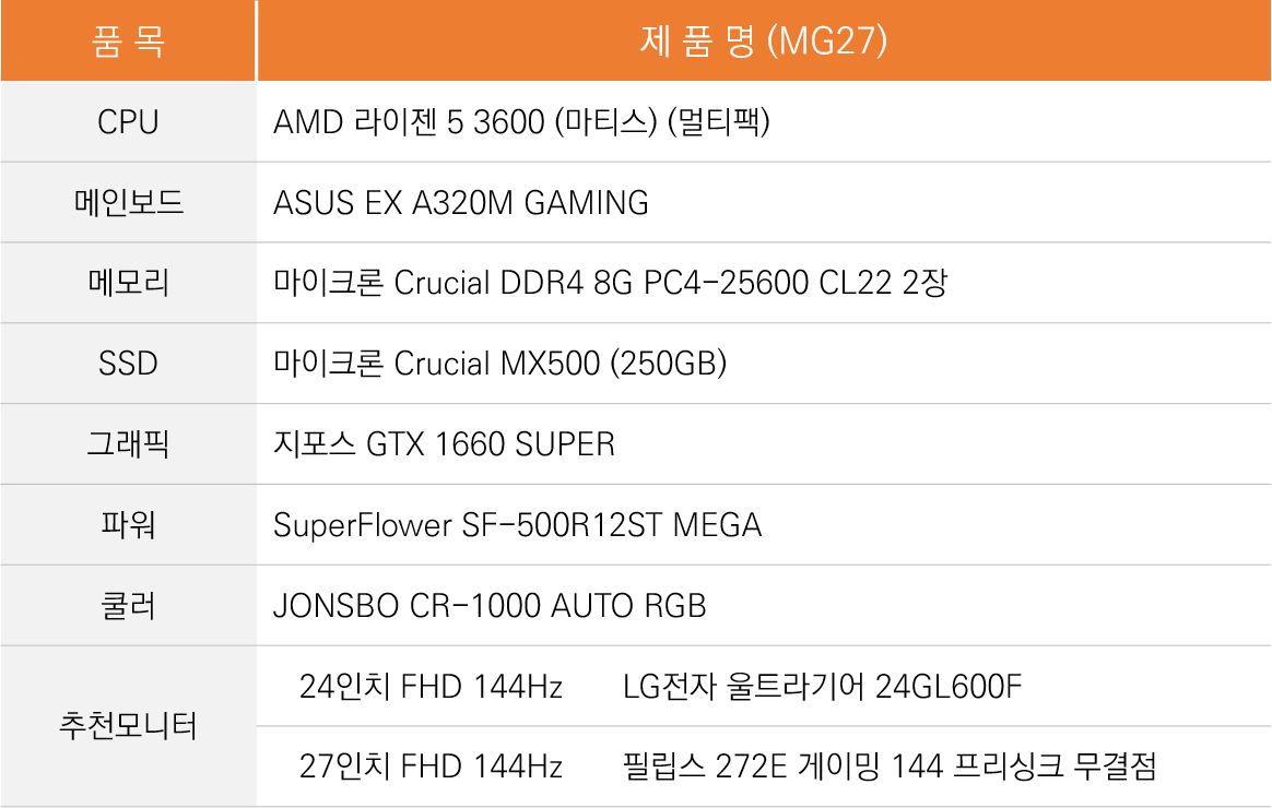 AMD 라이젠 5 3600 CPU로 구성된 게이밍PC 견적으로, 같은 90만 원대 견적인 MG104F3와 동등한 성능의 견적입니다. AMD 라이젠과 인텔 CPU 중 선호하는 CPU 견적으로 선택하시면 될 것 같습니다. 그래픽카드는 MG104F3와 마찬가지로 GTX 1660 SUPER로 구성되는데, 이 역시 재고 상황에 따라 여러 제조사 제품으로 변경되어 구성됩니다.