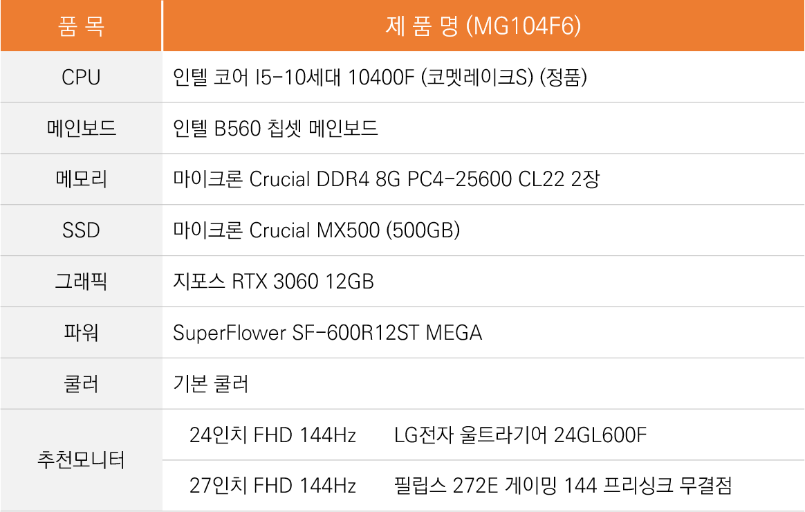 AMD 라이젠 5 5600X CPU와 RTX 3070 그래픽카드의 조합입니다. 비슷한 사양의 MG107F에 비해 가격이 20만 원 정도 더 높죠. 트리플A급 게임을 QHD 해상도에서 원활하게 플레이할 수 있는 견적입니다.